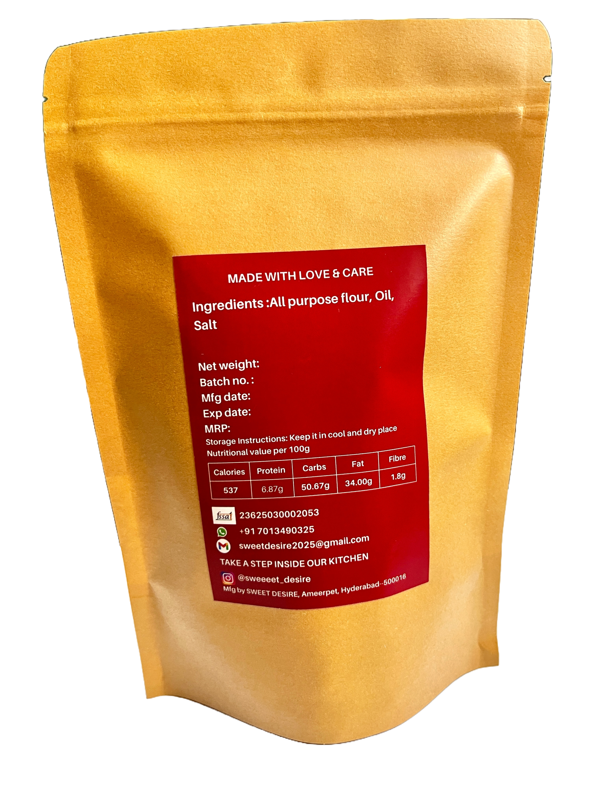 A Traditional Indian Namkeen made up of All purpose flour, oil, salt and tinch of carom seeds