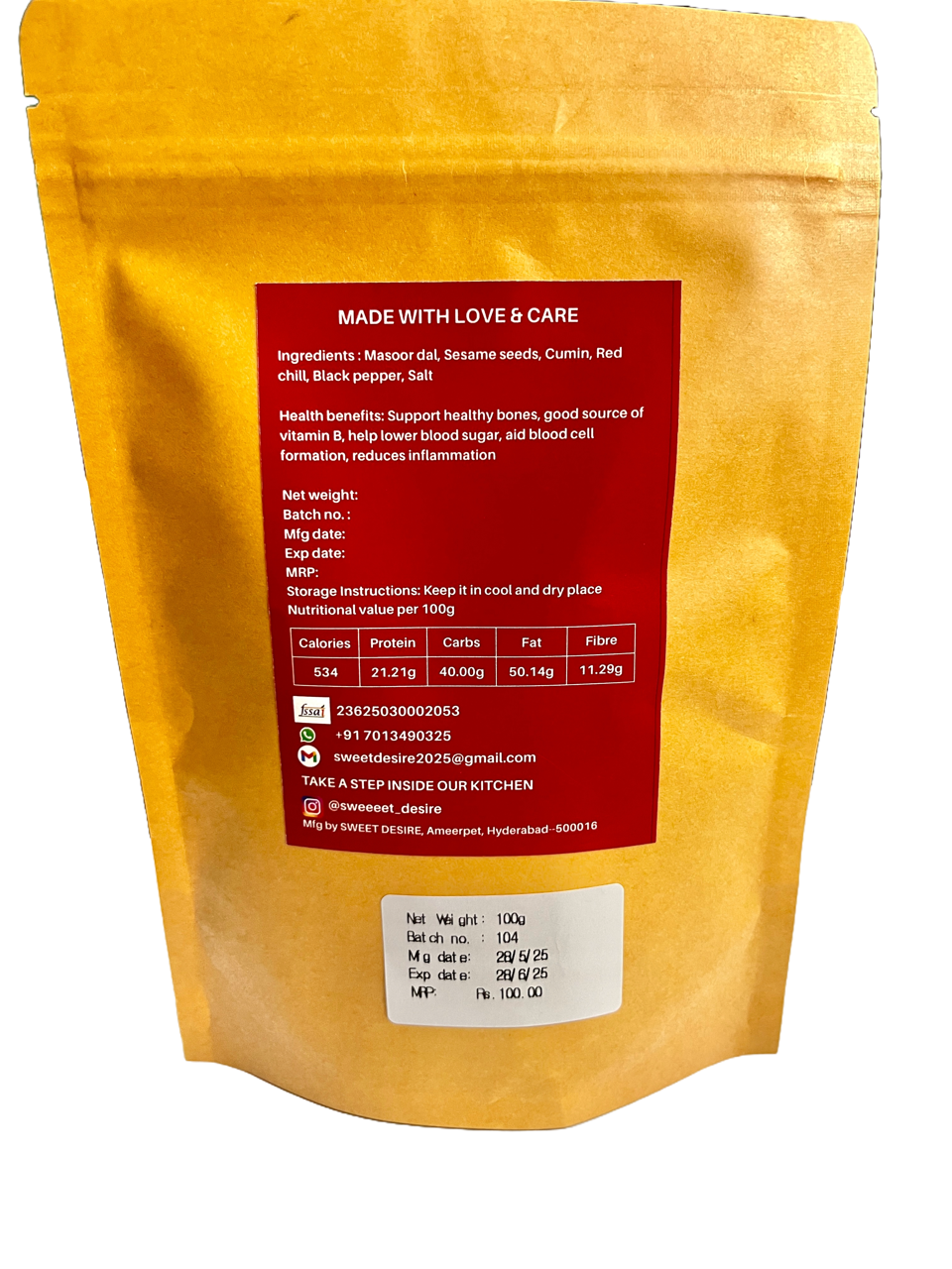 Masoor dal, Sesame seeds, Cumin, Red chill, Black pepper, Salt